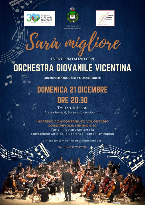 Bolzano Vicentino (VI)📍 Teatro Ariston - Bolzano Vicentino (VI) 📅 21 dicembre 2025 - ore 20.30 Il Teatro Ariston di Bolzano Vicentino (VI) ospiterà il concerto dell’Orchestra Giovanile di Vicenza, una serata di grande musica e partecipazione dedicata alla solidarietà. L’ingresso è gratuito, con offerta libera a favore di Città della Speranza, per sostenere la ricerca scientifica pediatrica. Un appuntamento speciale in cui il talento dei giovani musicisti si unisce a un gesto concreto di speranza.
