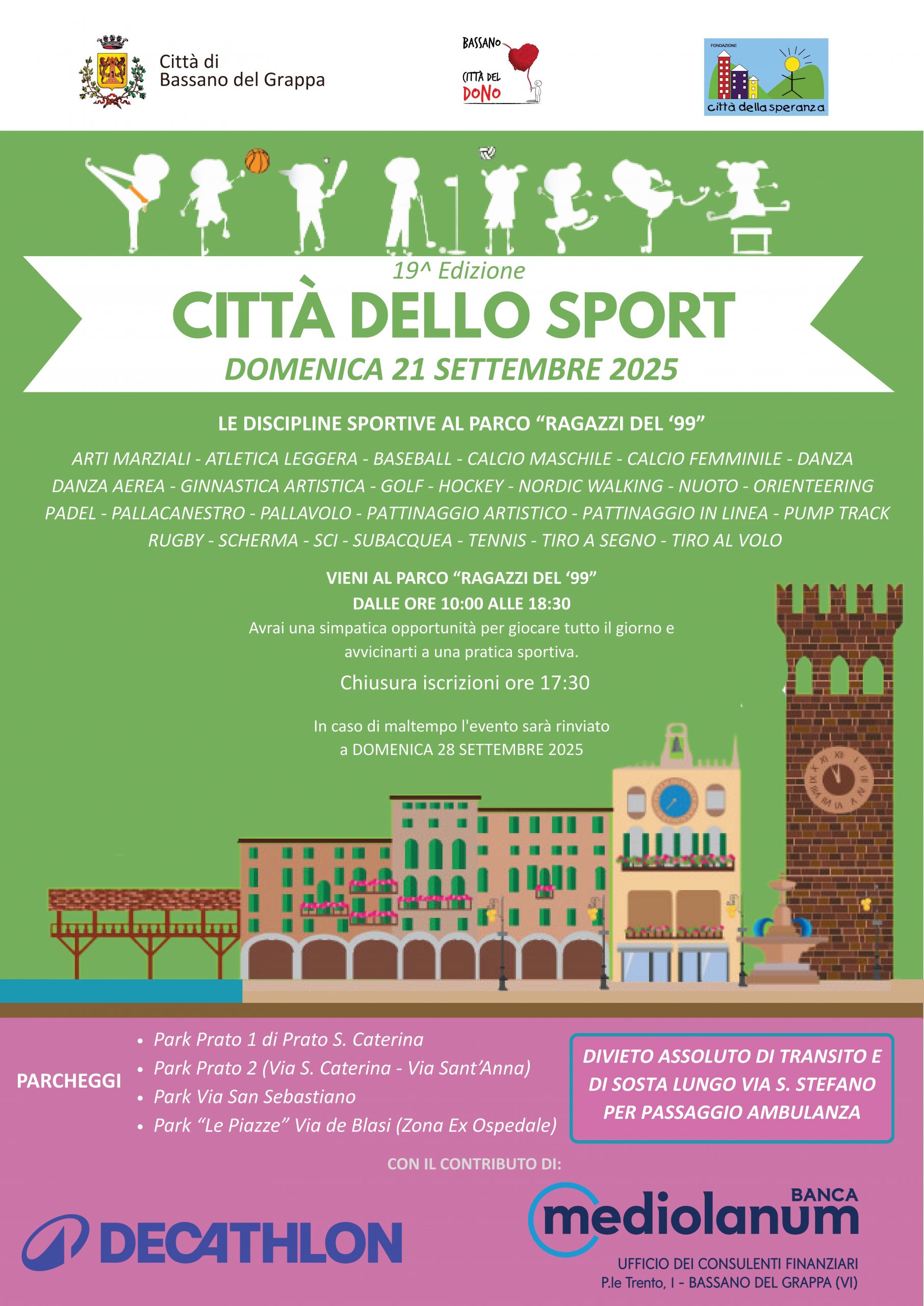 Vieni a scoprire, provare e vivere lo sport in tutte le sue forme! Al Parco “Ragazzi del ’99” ti aspetta una giornata ricca di attività con “Città dello Sport”, un evento pensato per promuovere il movimento, il gioco e la solidarietà. Dalle ore 10:00 alle 18:30, potrai partecipare a tantissime discipline sportive, divertirti, e avvicinarti a nuove pratiche, grazie alla presenza di associazioni e istruttori.